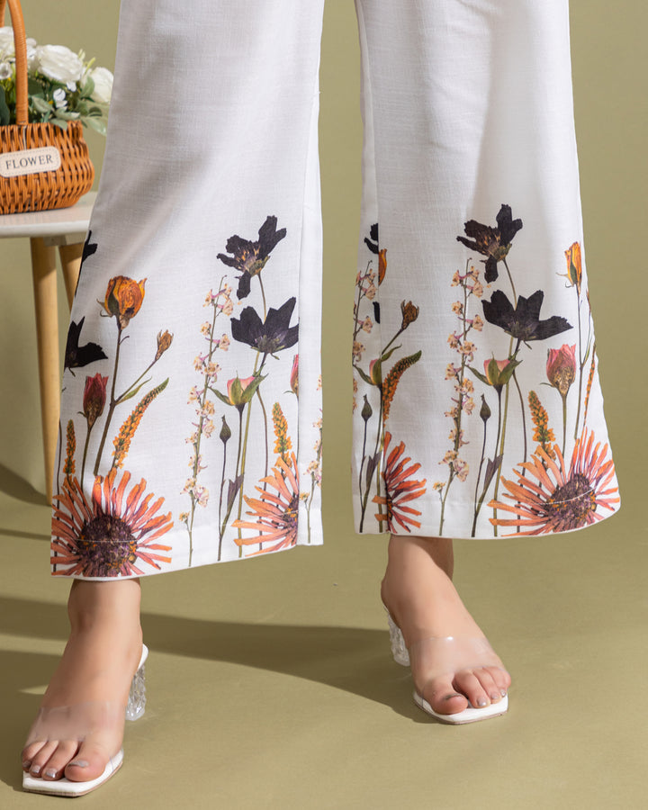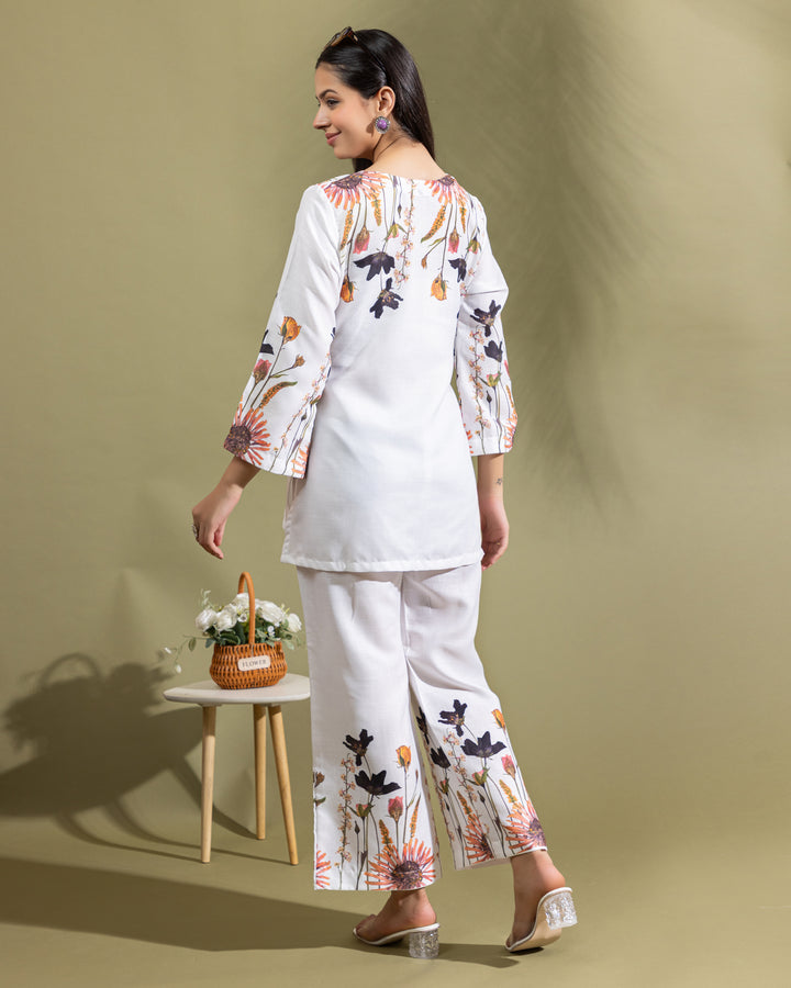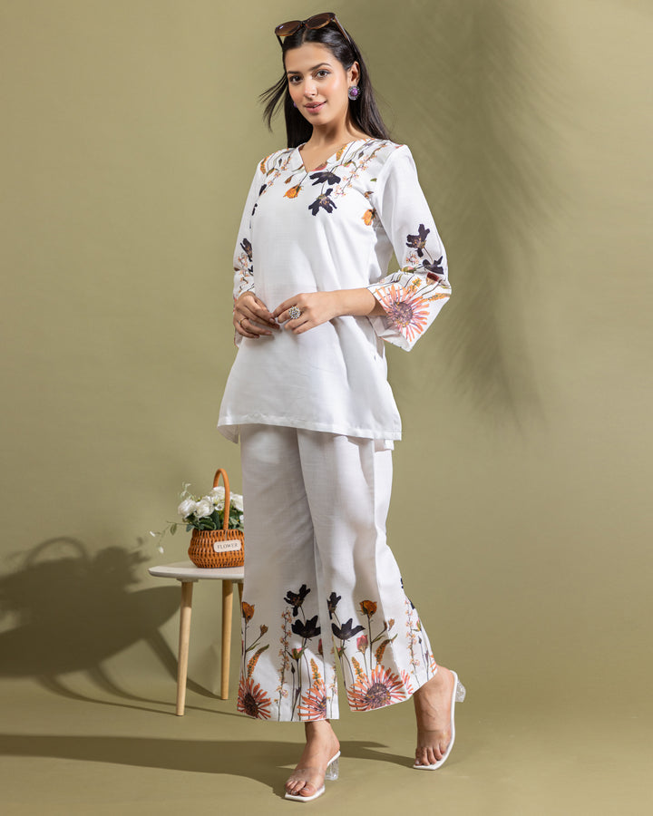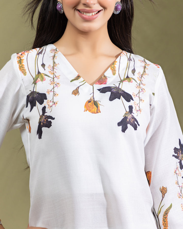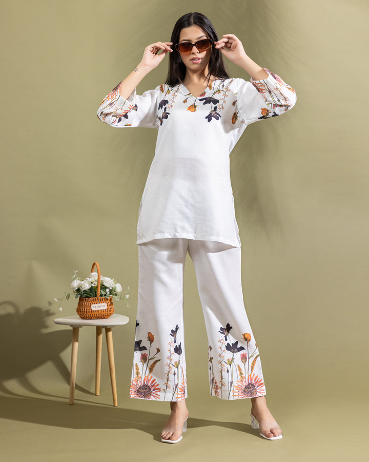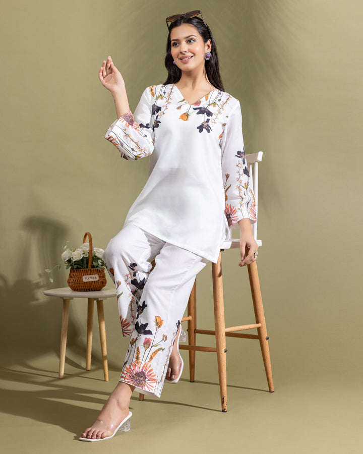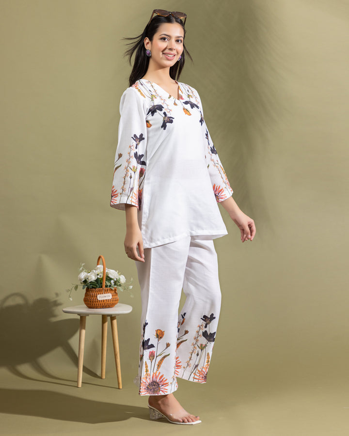 The Amber Bloom Co-ord Set blends soft cream cotton with delicate floral prints in warm yellow and orange tones. With a flattering V-neck, bell sleeves, and printed accents on the sleeves and pant hems, it’s an effortlessly chic pick for daytime outings and casual celebrations.