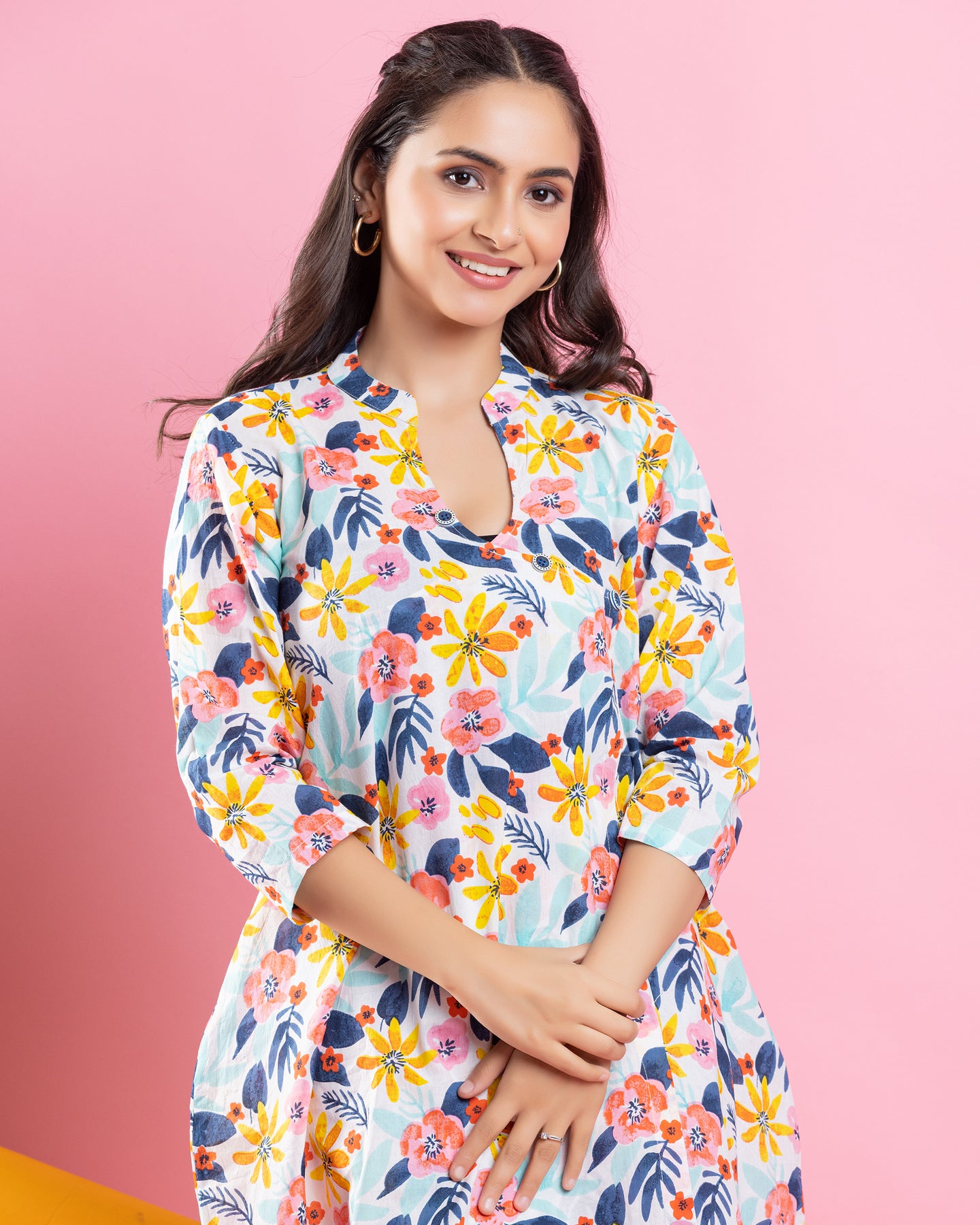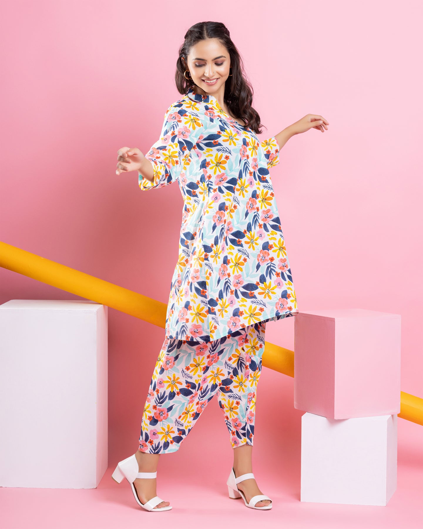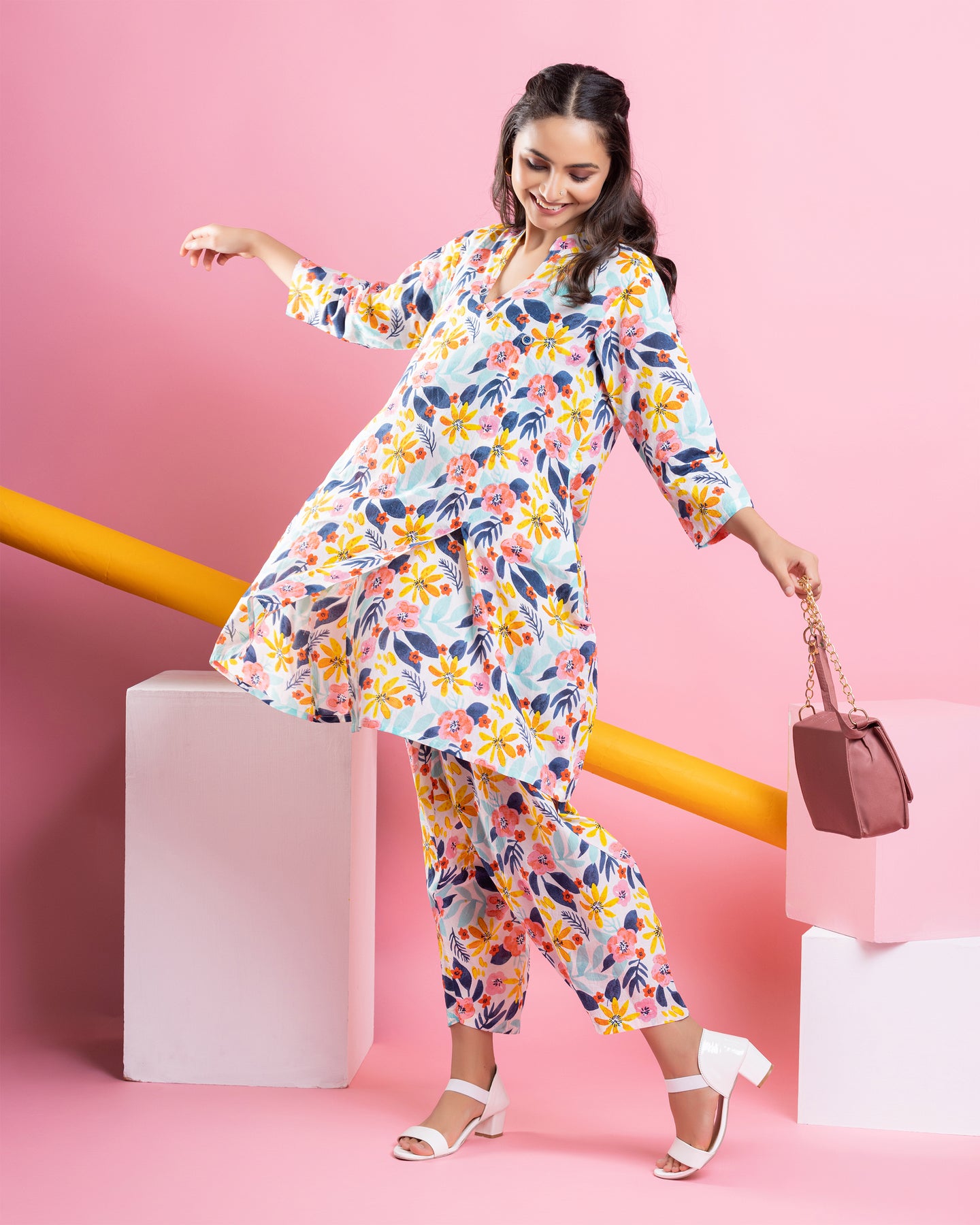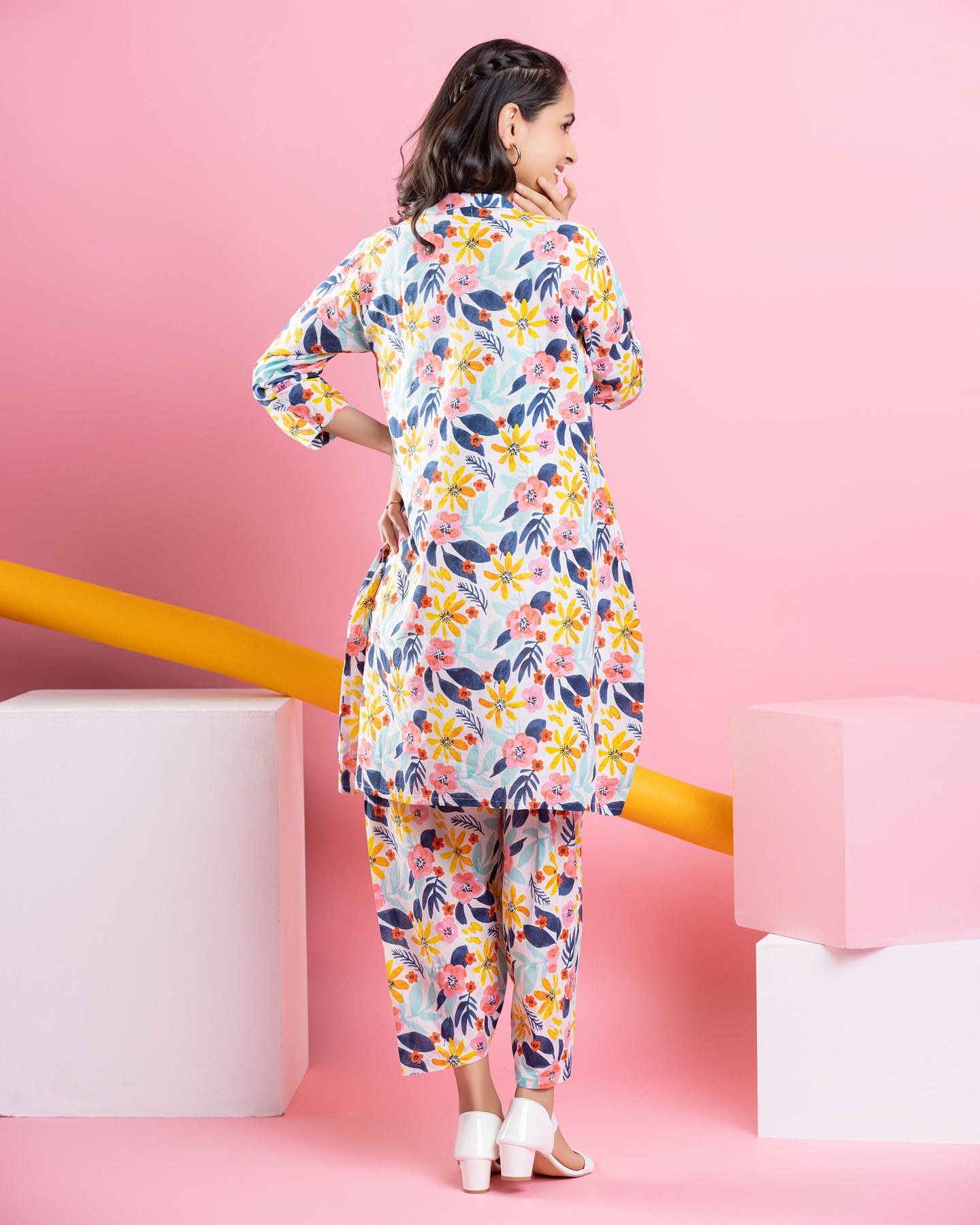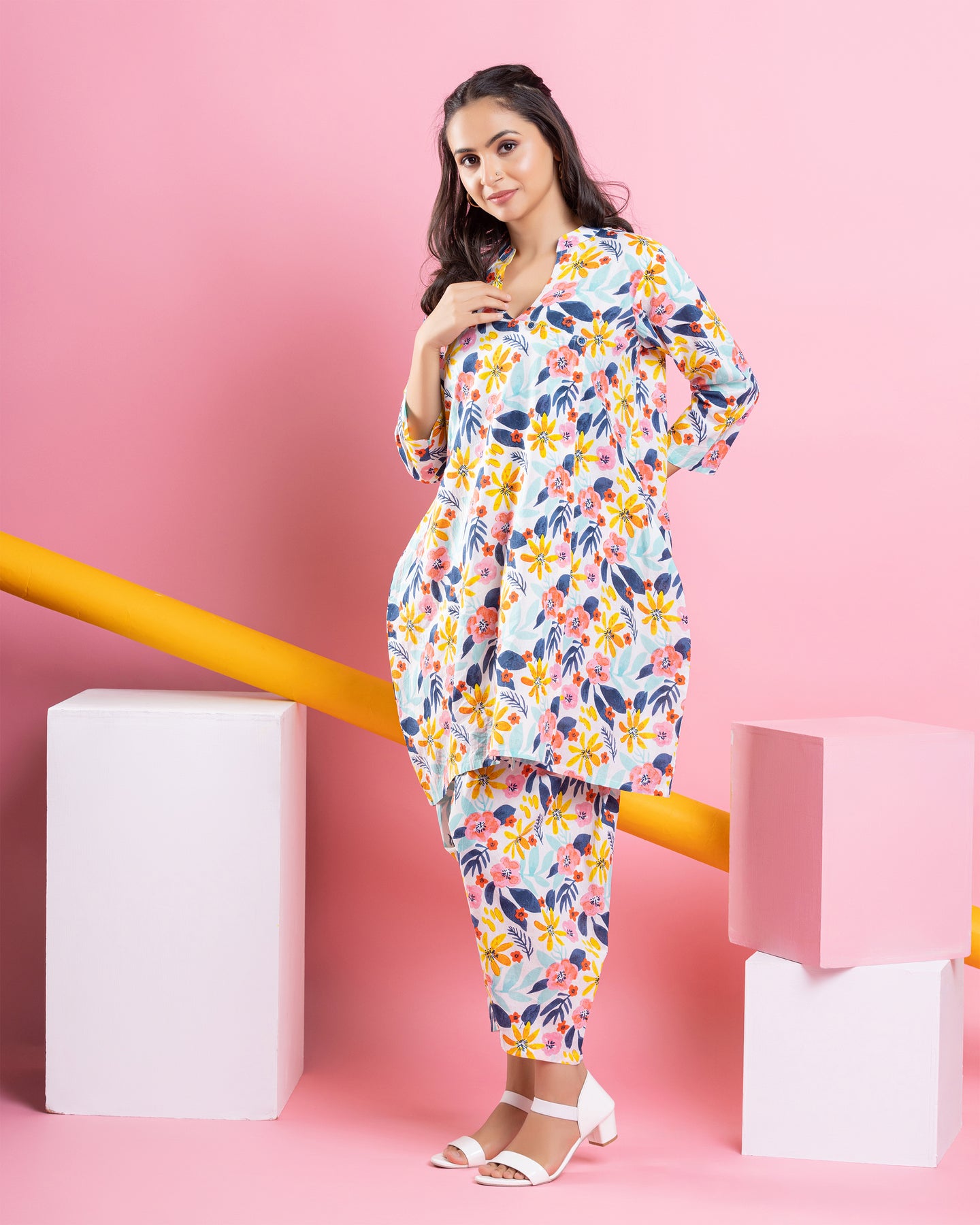 Exude a chic and relaxed vibe with our Cabana Angrakha Style Co-ord Set. Made from pure cotton, this comfy yet stylish outfit is perfect for any occasion. With its long lasting floral prints and A-line design, you'll surely turn heads wherever you go. Plus, it comes with a salwar for added comfort. Get ready to feel confident and beautiful in this stunning co-ord set!