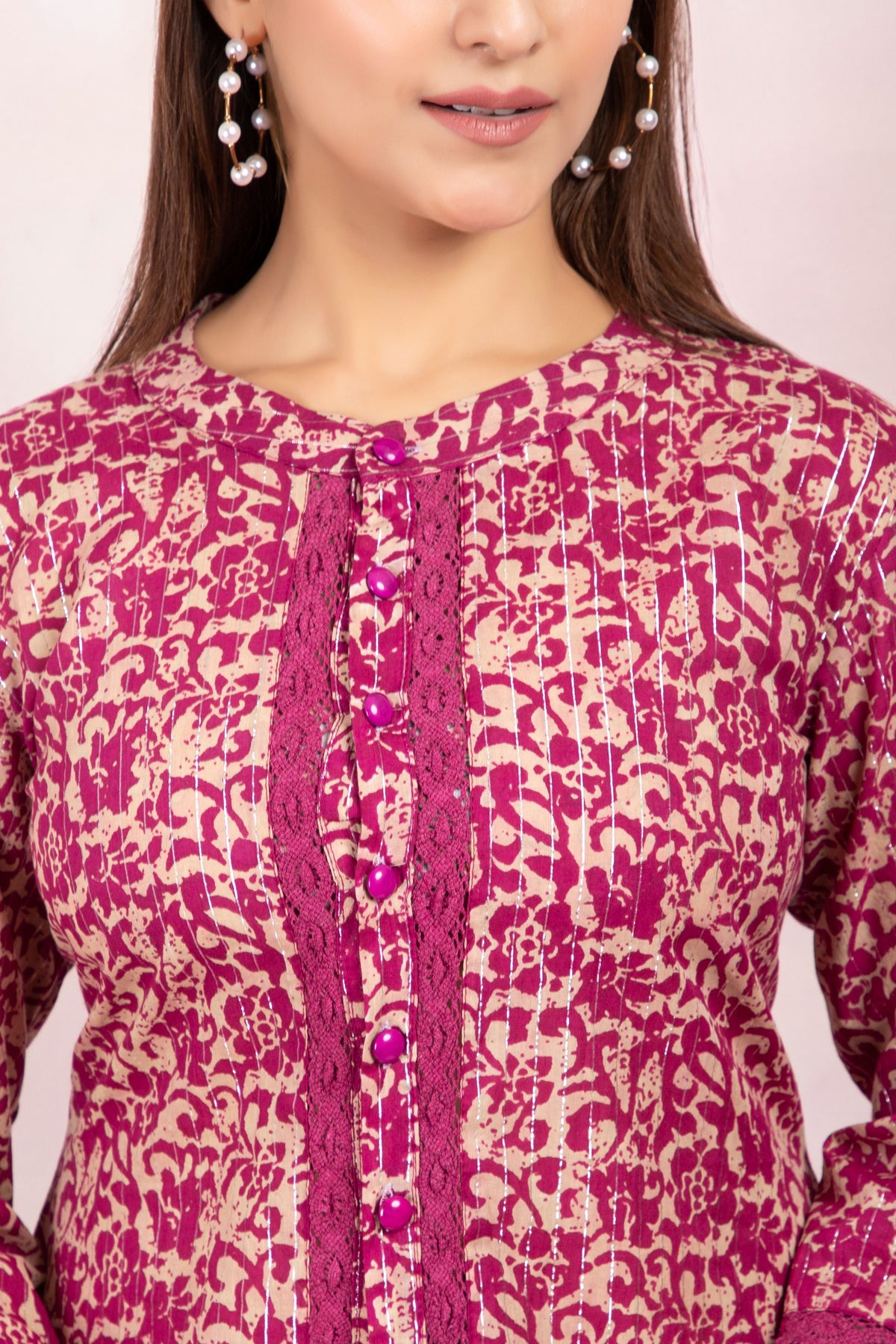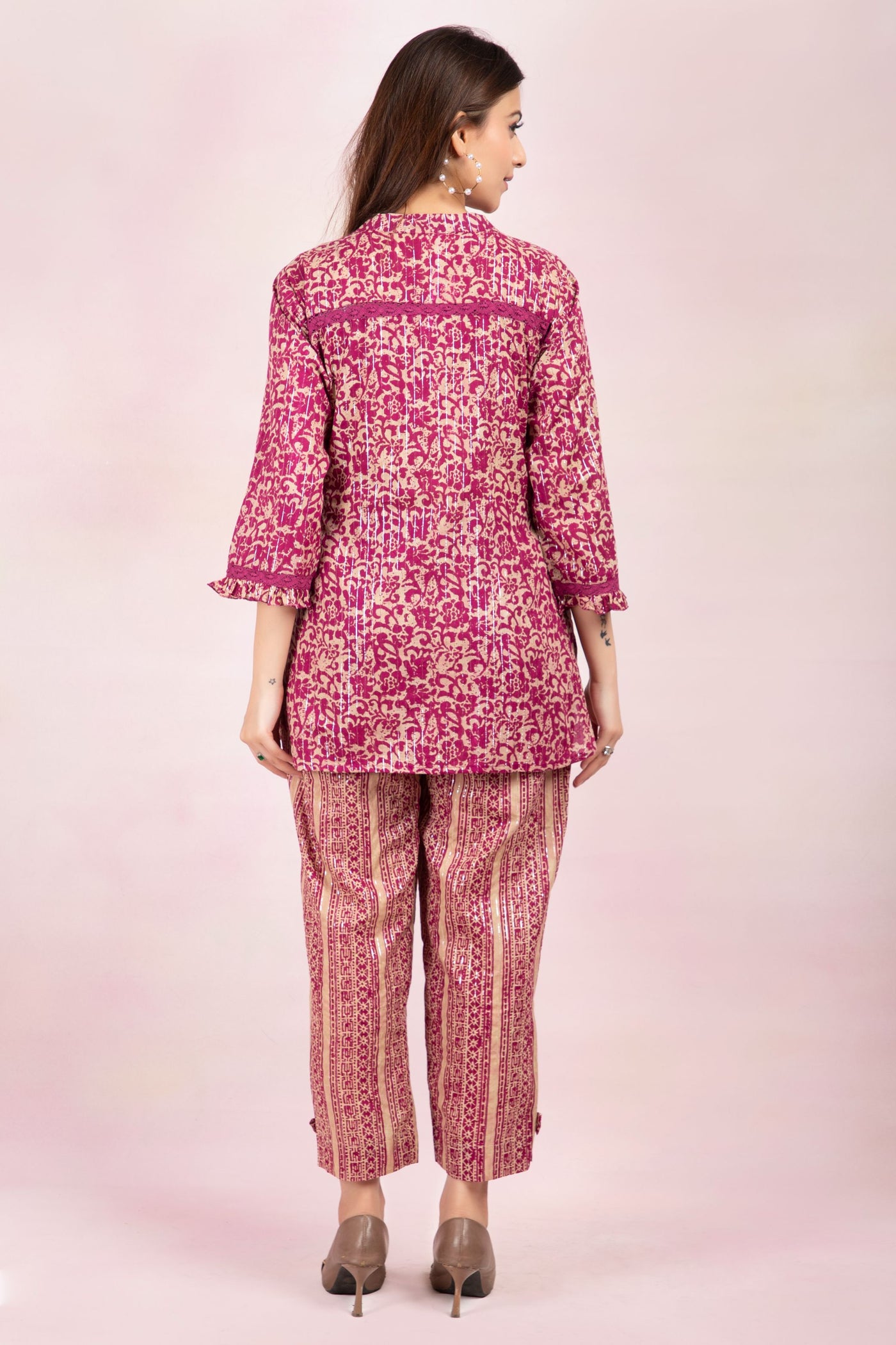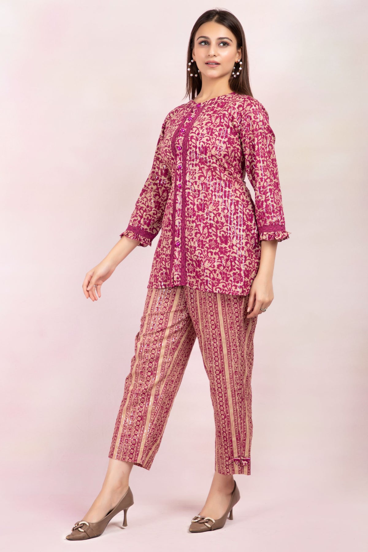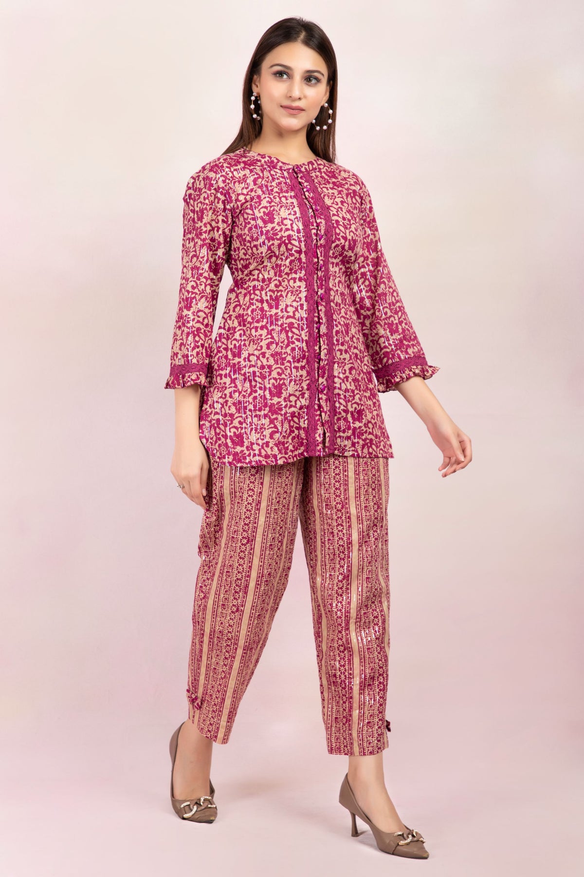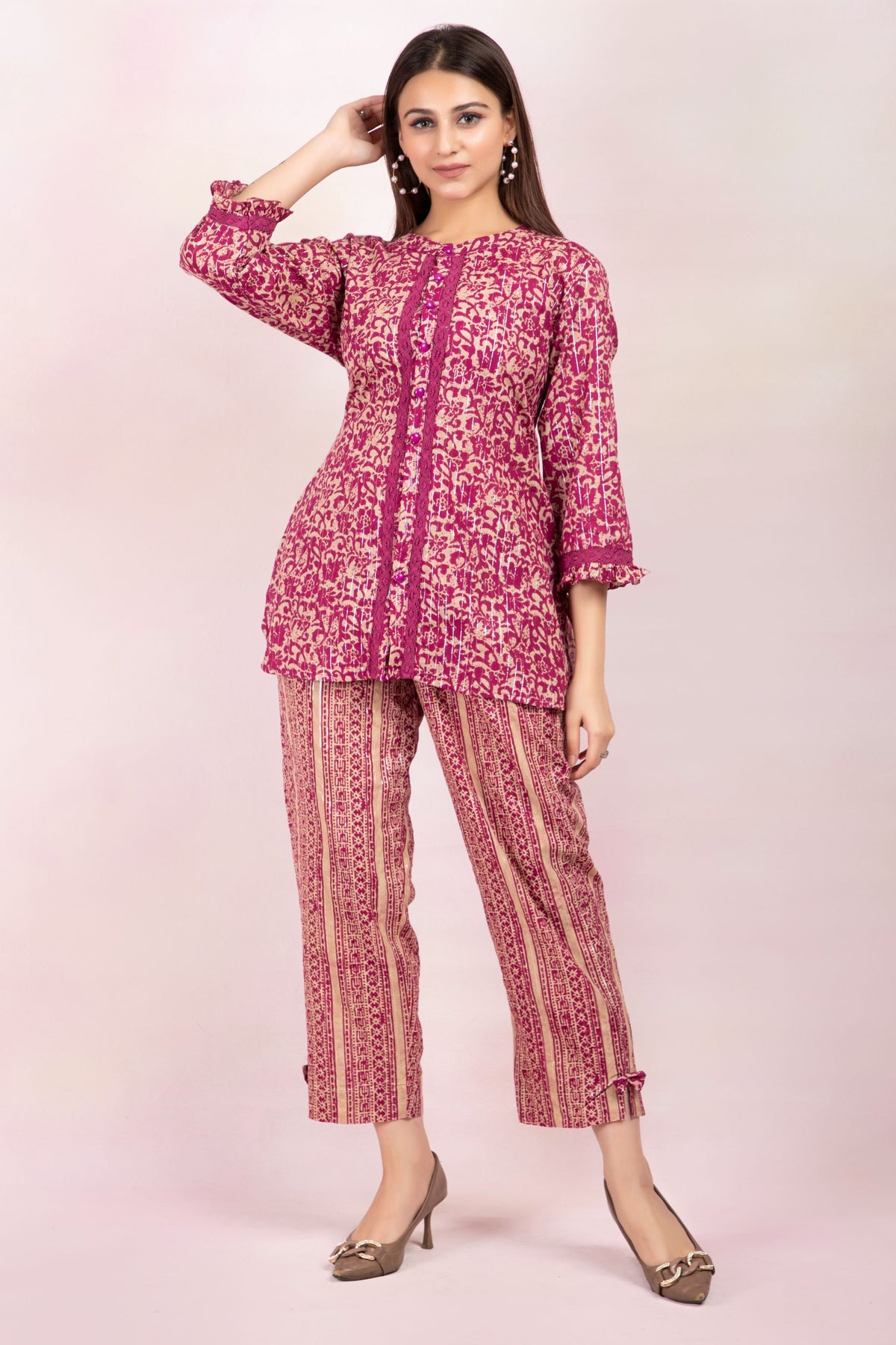 •    This co-ord set comes with a straight top with round ghera & pants.