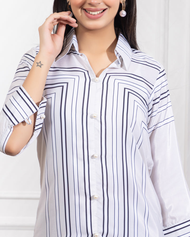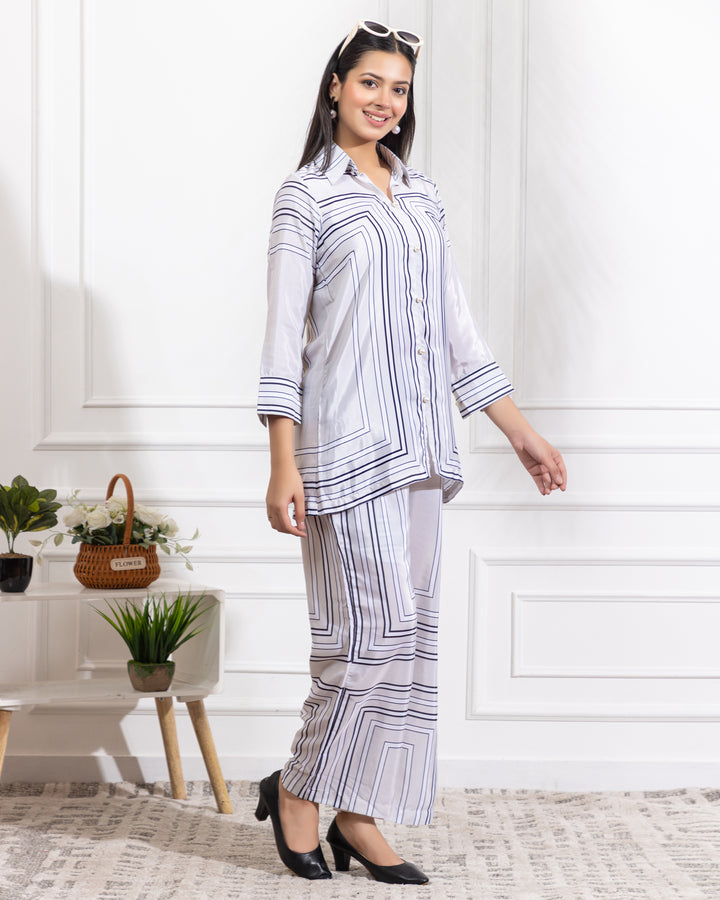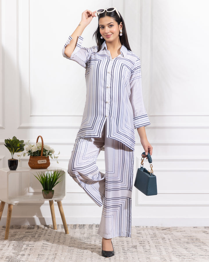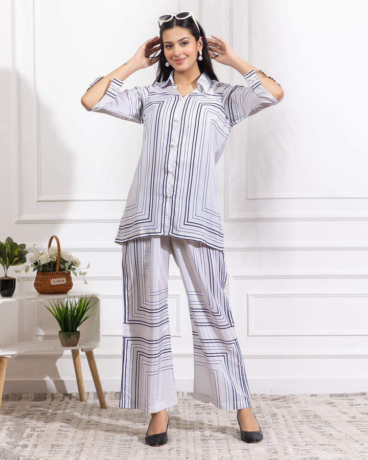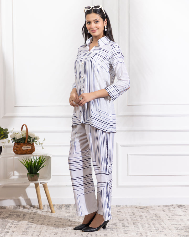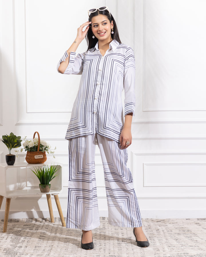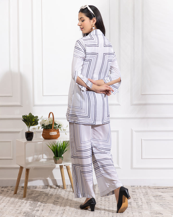 Crafted in soft, flowy crepe, the Luxe Crepe Co-ord Set blends effortless structure with elevated detail. The collared neckline and pearl buttons add charm to the sleek black-and-white geometric print, making it perfect for stylish outings and premium gatherings.