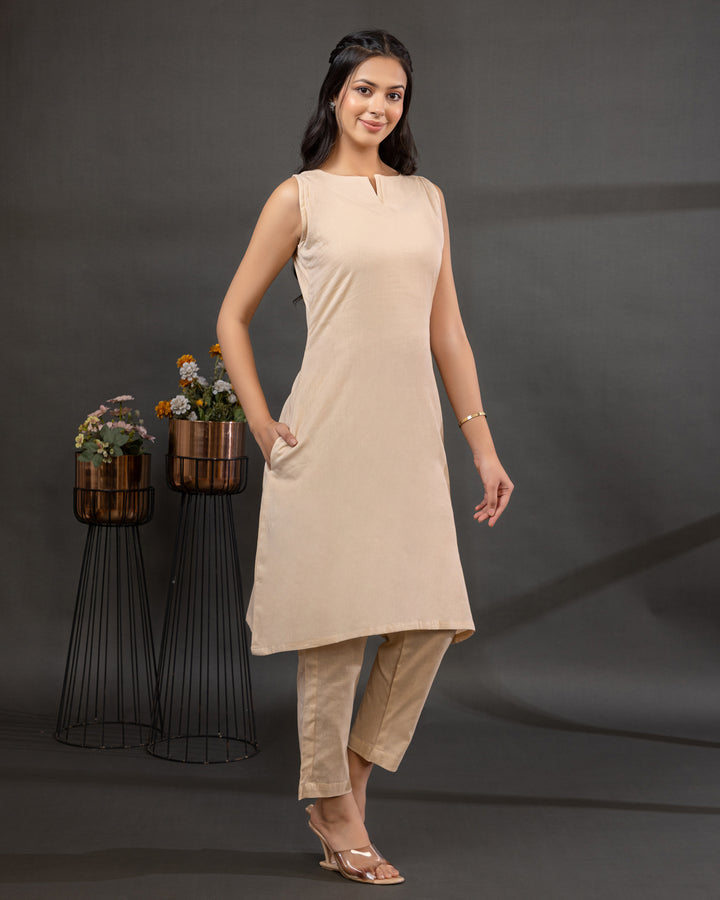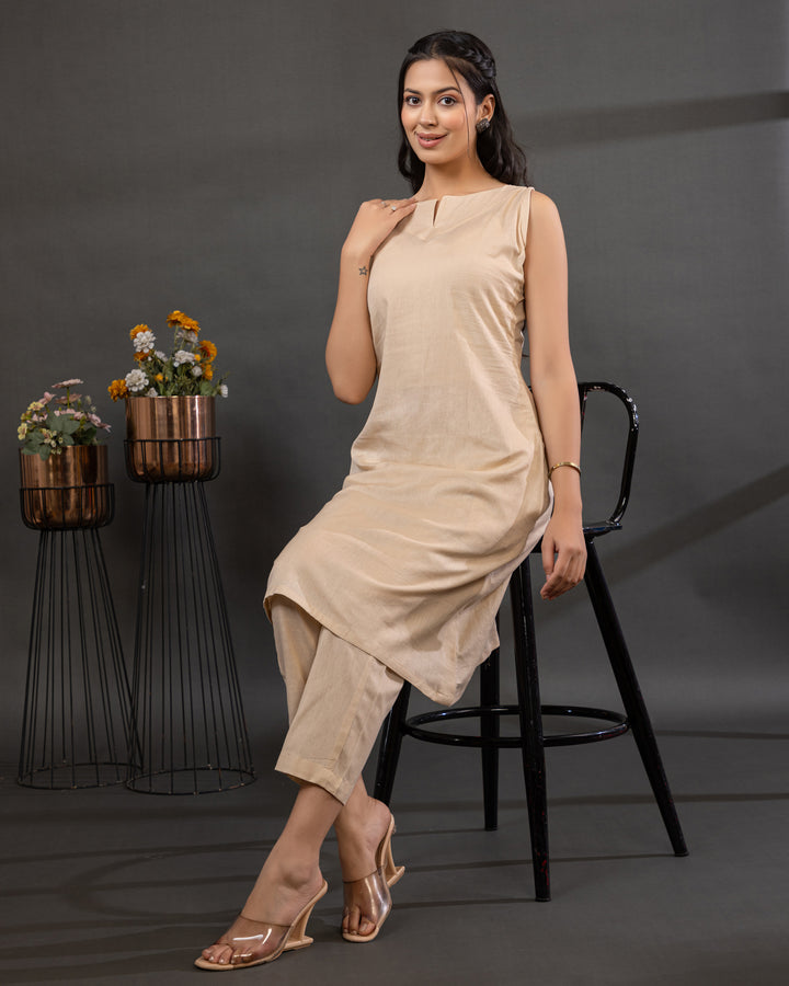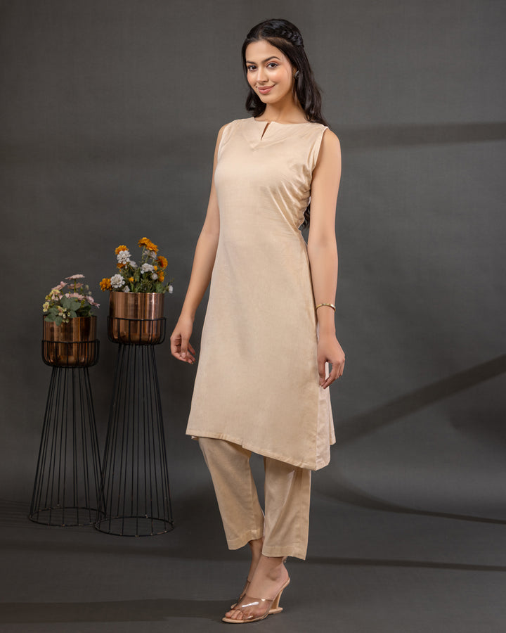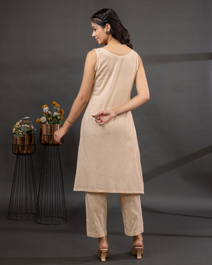 Beige linen co-ord set with lace detailing, two pockets, and 1-inch extra margin – Meher by PynkPosh.