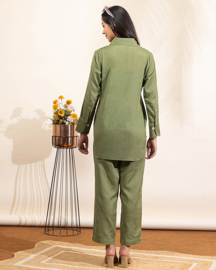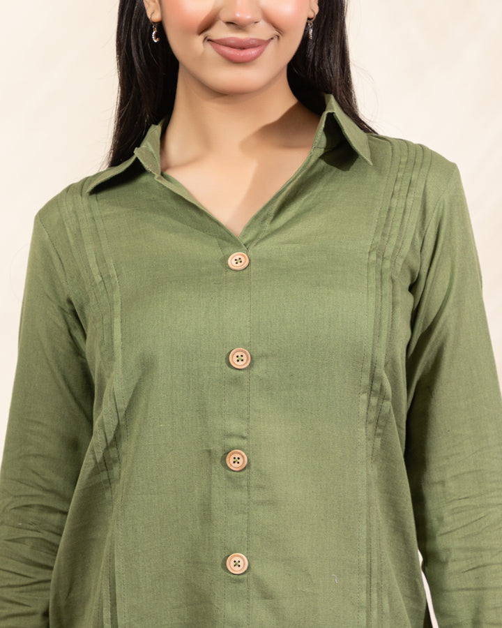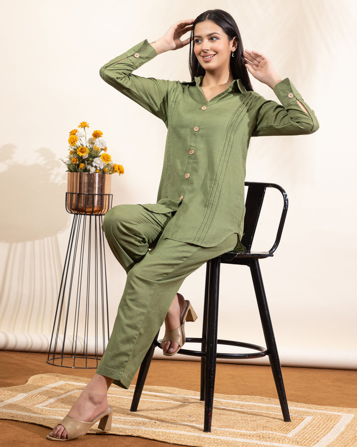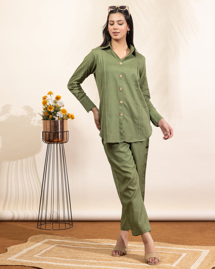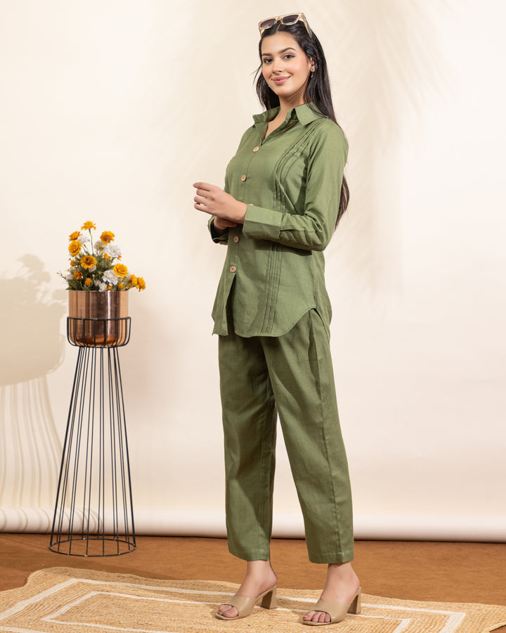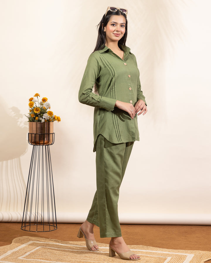 Olivia Linen Co-ord Set – Chic Green Pleated Outfit with Wooden Buttons | PynkPosh