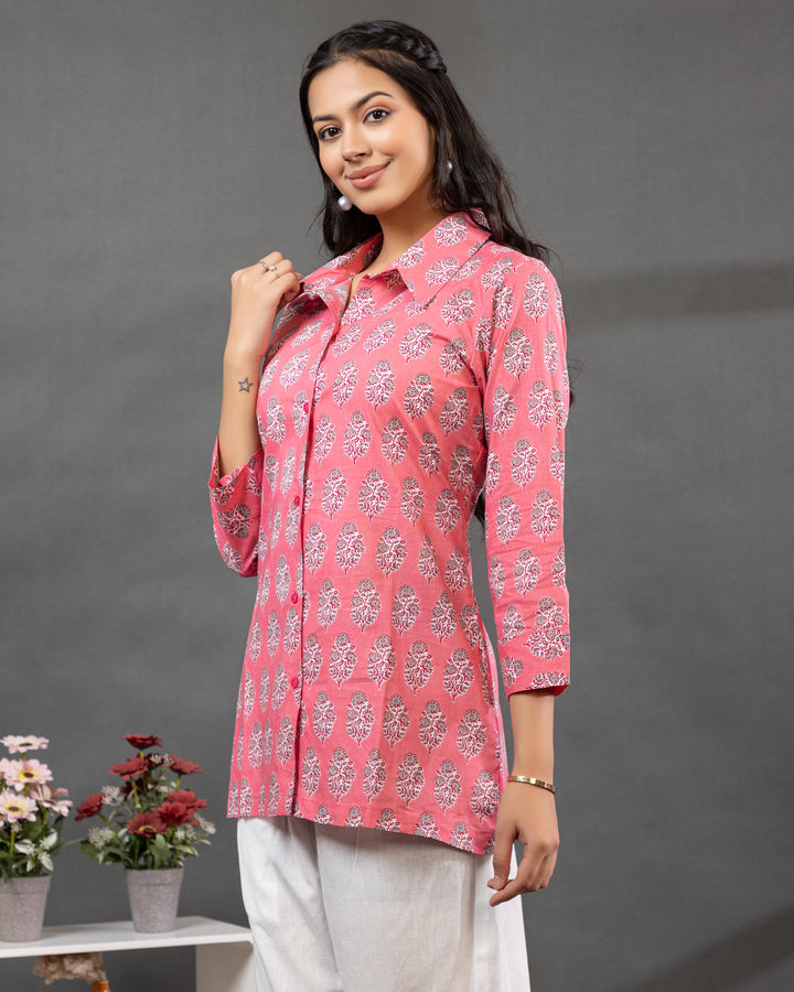 Phoolwari Cotton Shirt Kurti in pink with collar and button-down front