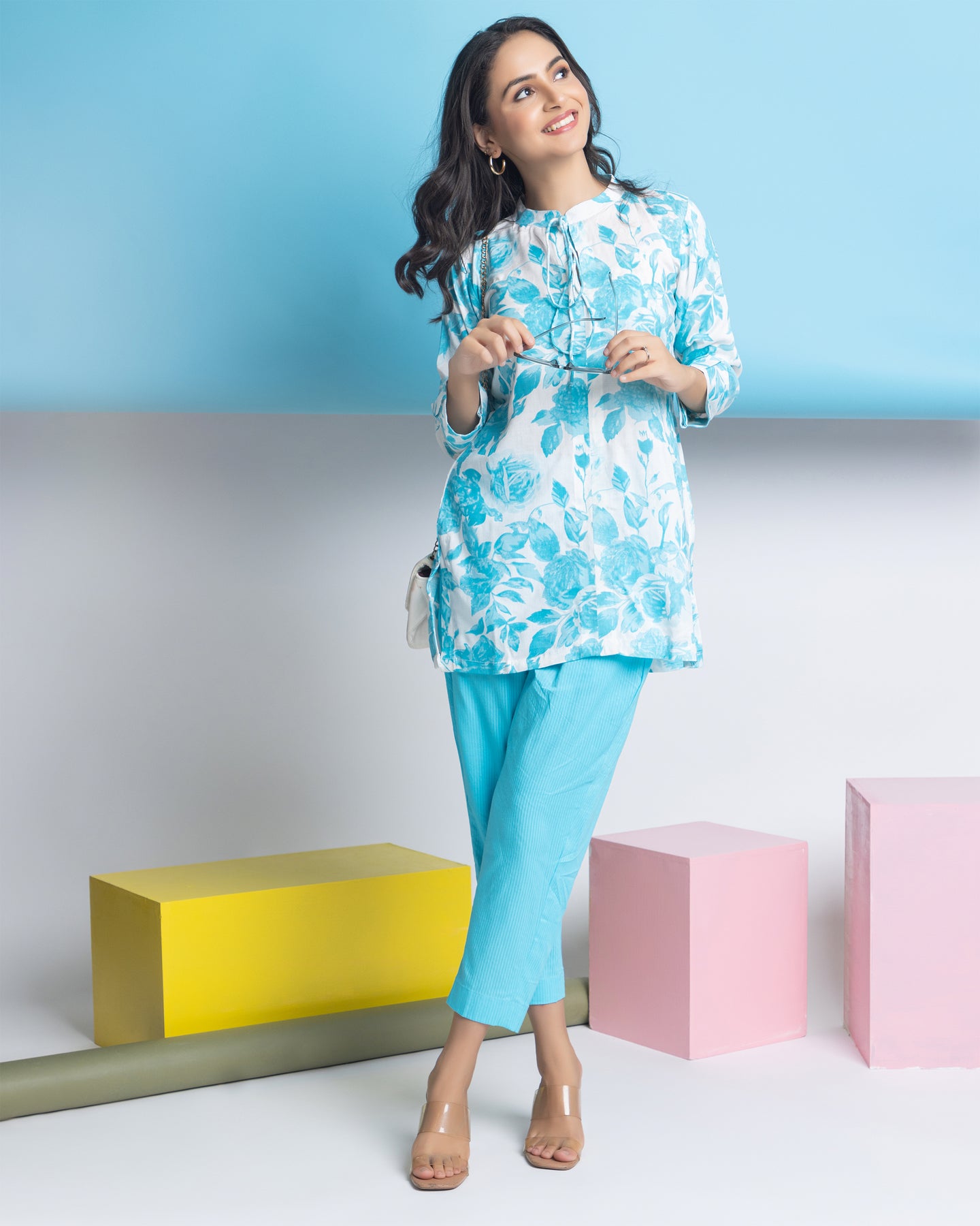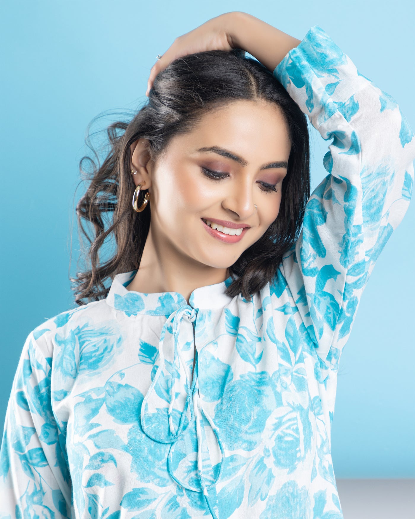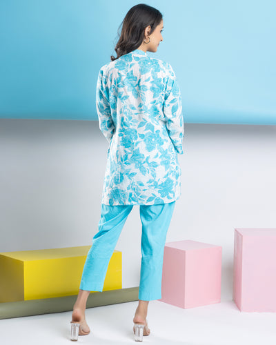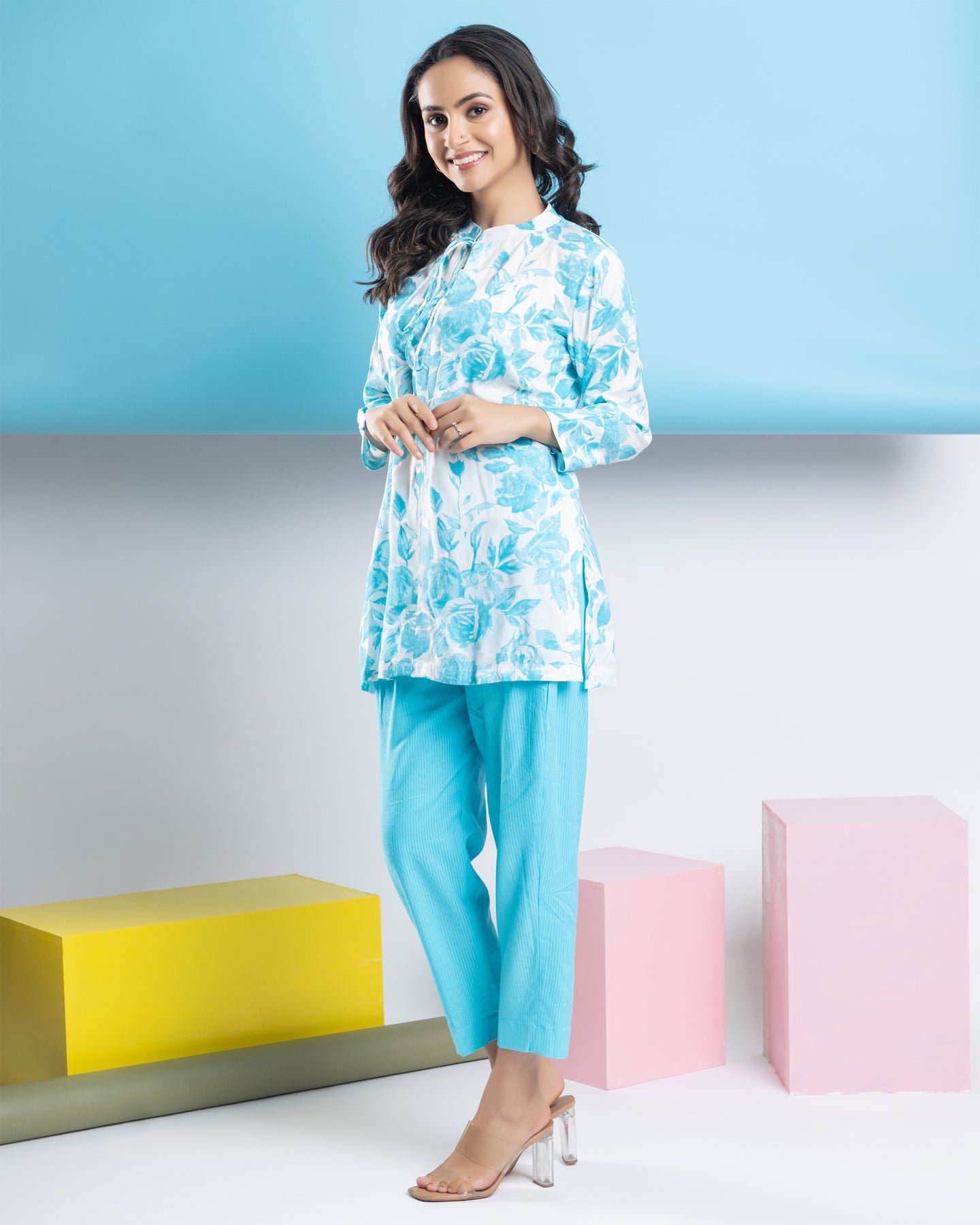 White and blue co-ord set made out of premium fabric with beautiful long-lasting floral prints on it. it is a perfect outfit for hanging around in the summers.