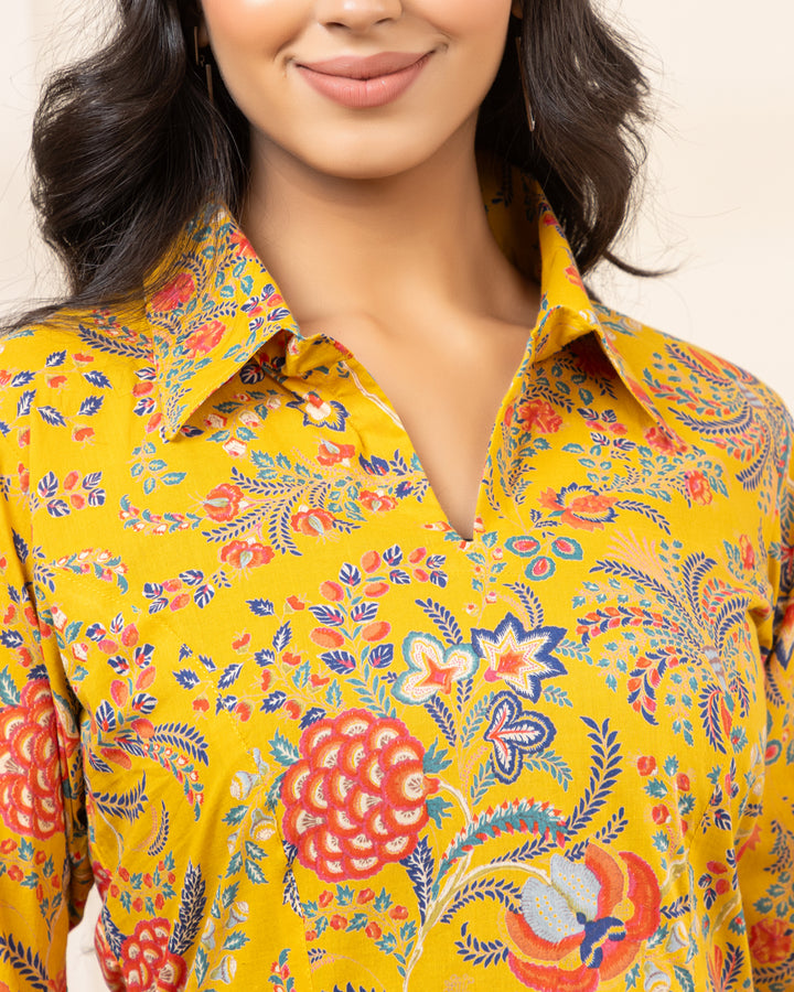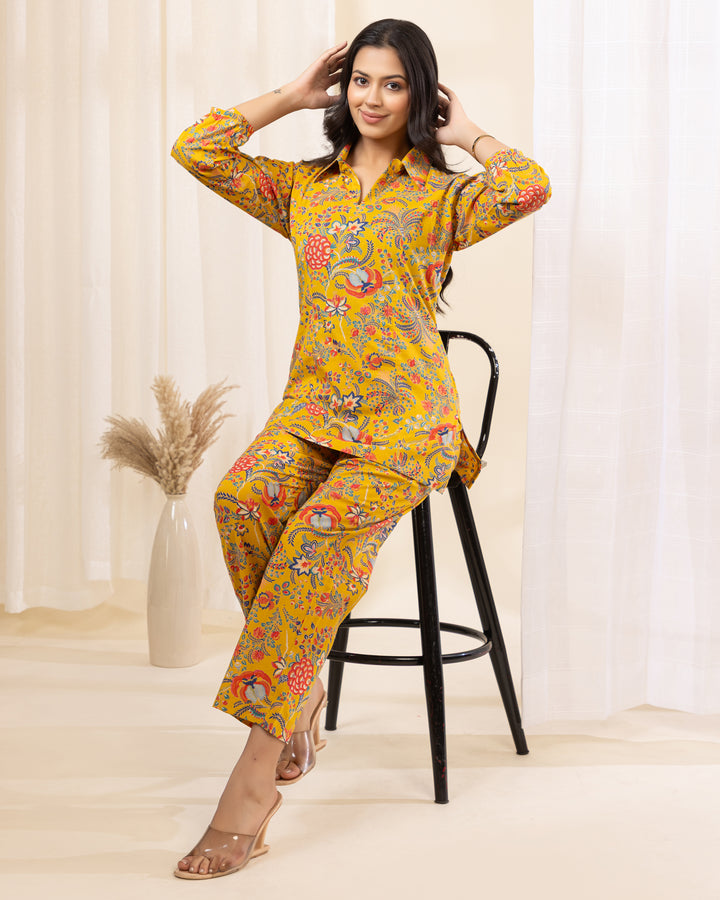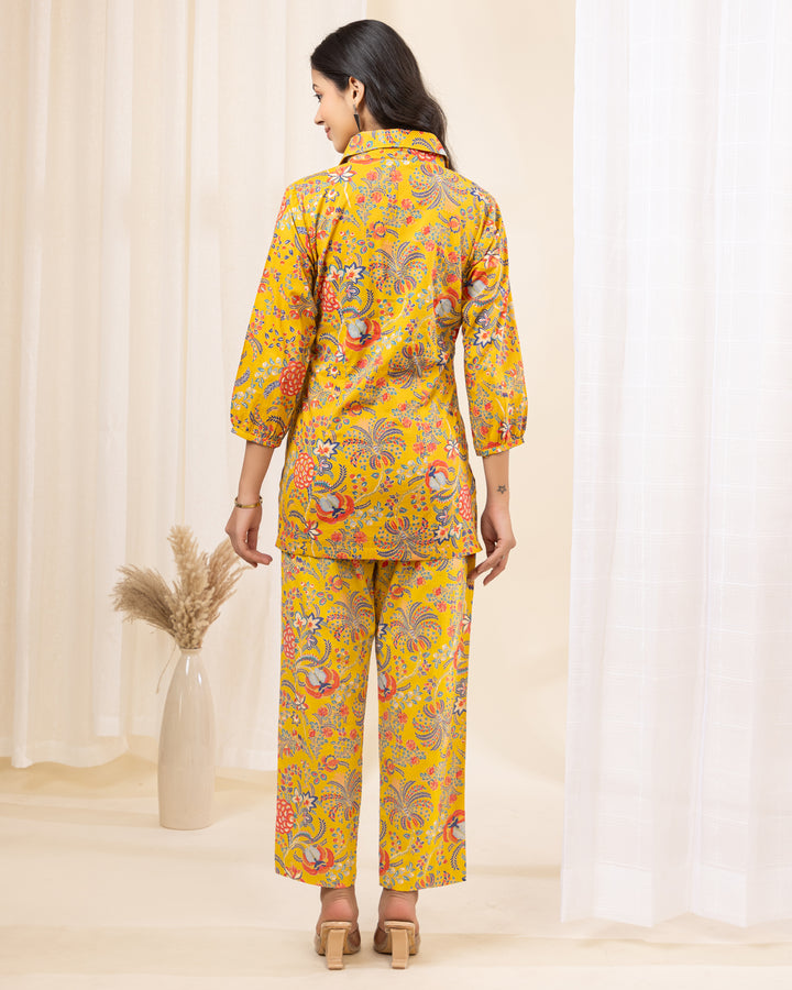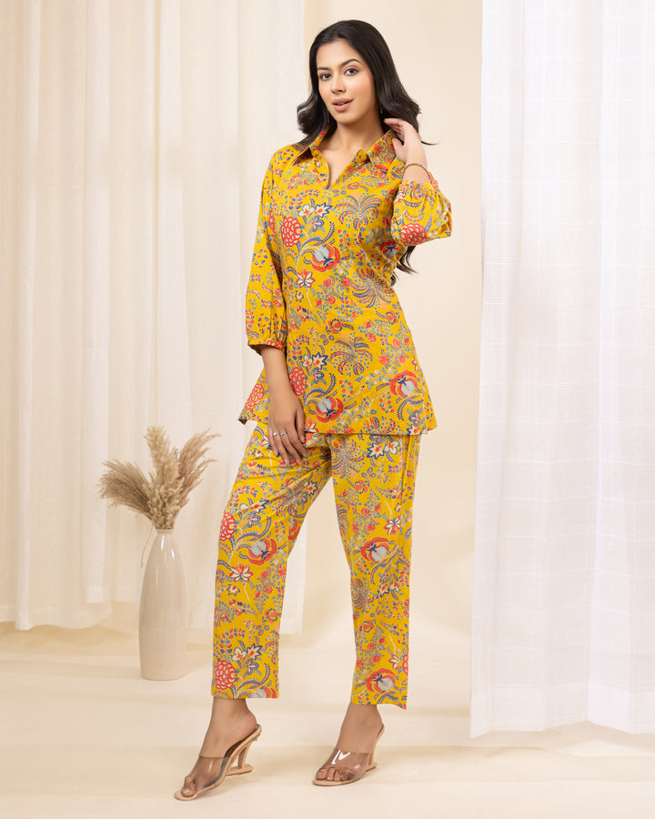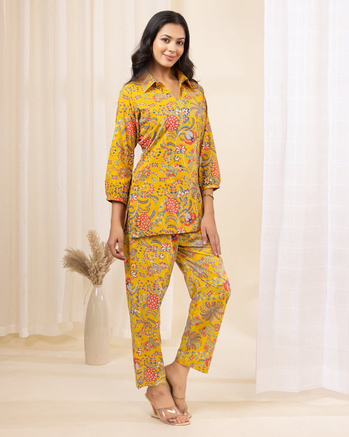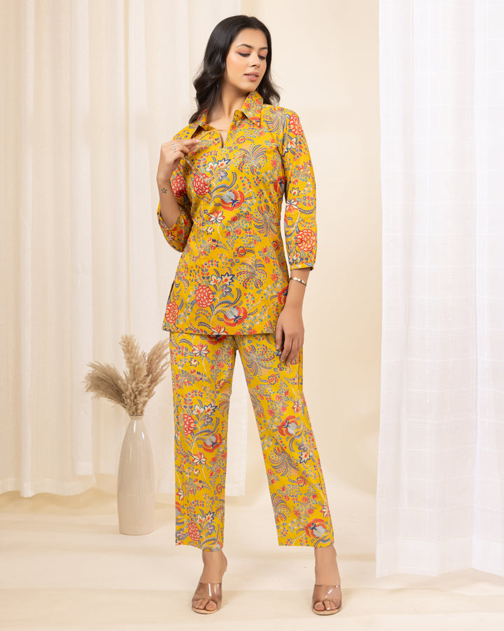 Zyra Petal Cotton Co-ord Set in Yellow Floral Print – Collared Cotton Co-ord for Women